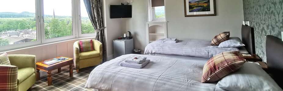 The front rooms overlook the picturesque town of Callander, Gateway to the Highlands, and enjoy some truly magnificent views down the valley to The Loch Lomond and Trossachs National Park, an area famous for history and beauty. We are conveniently situated on a quiet street less than a minutes walk from the hussle and bussle of town and offer free onsite parking for our guests.